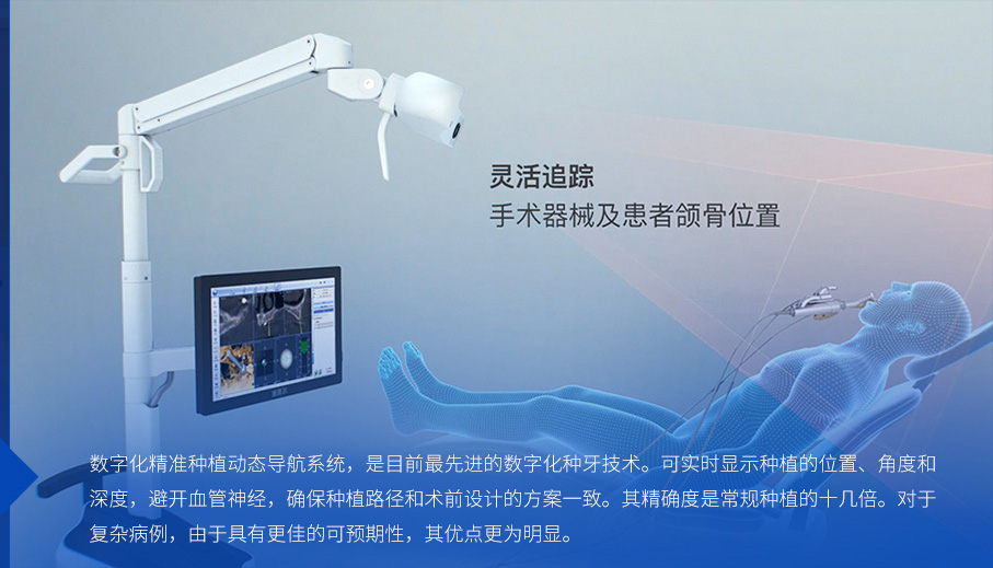 主要应用于口腔种植手术的术前计划和术中引导,术前采用数字化导航设备,以修复为导向对种植体的位点、轴向进行精准方案设计;方案确定后,医护团队将遵循方案进行微创种植牙手术,手术结合精准的红外光学定位技术,高度实现手术器械、医学影像和人体空间位置的融合,将种植体准确植入患者口中,可缩短手术时长,减少术后痛苦。